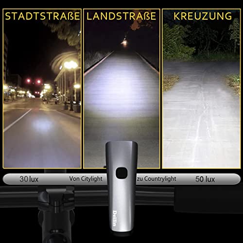 【Leistungsstarke Li-ion Akku & 2 Licht-Modi】 Neuestes Modell USB-Wiederaufladbare Fahrradlicht Set mit Li-Ion 2600mAh Batterie für eine super lange Laufzeit von bis zu 9 Stunden im Volllichtmodus ( Niedrige Helligkeit für 9 Stunden, Hoche Helligkeit für 6 Stunden). Deilin Frontlicht mit 50 Lux ist völlig ausreichend für eine gute Beleuchtung am Fahrrad. Im dunkeln lässt sich mit dem bike light sehr gut radeln.
