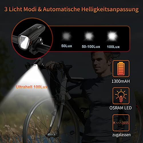 【3 Lichtmodi & Smart Helligkeitssteuerung】Deilin Frontlicht mit ultraheller 100/50 Lux ist völlig ausreichend für eine gute Beleuchtung am Fahrrad. Im dunkeln lässt sich mit dem Fahrradlampen sehr gut radeln. Mit intelligentem Einstellmodus und OSRAM LED ausgestattet, die Helligkeit der Scheinwerfer passt sich automatisch nach der Umgebungslichtstärke zwischen 50-100 Lux an, um die optimale Sichtbarkeit und Batterielestrom zu behalten.
