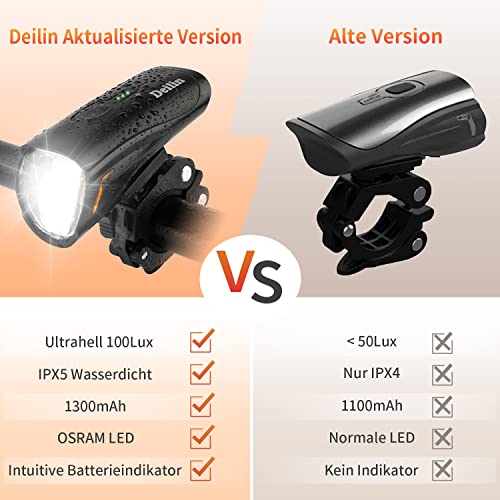 Specification: Deilin Upgraded LED Fahrradlicht Set, StVZO Zugelassen Fahrradlampe, Zugelassen USB Aufladbar Fahrradbeleuchtung, IPX5 Wasserdicht Fahrradlicht Vorne Frontlicht& Rücklicht Set