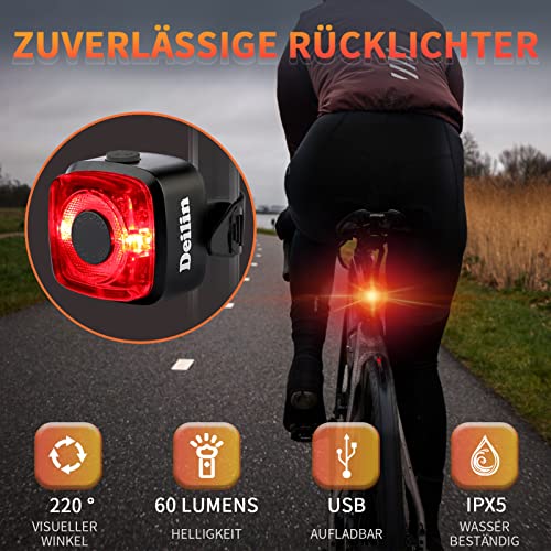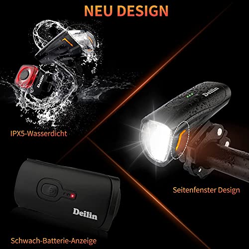 Deilin Upgraded LED Fahrradlicht Set, StVZO Zugelassen Fahrradlampe, Zugelassen USB Aufladbar Fahrradbeleuchtung, IPX5 Wasserdicht Fahrradlicht Vorne Frontlicht& Rücklicht Set