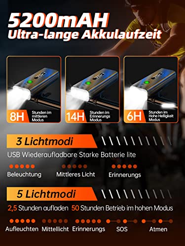 🚴【Power Bank Funktion】Mit 5200MAH Akkukapazität, kann dieses leistungsstarke Fahrradlicht als Powerbank für eine dringende Aufladung fungieren, wenn Ihr Telefon im Freien ausgeschaltet ist. Ein Licht in der Hand, alle Macht in der Hand.
