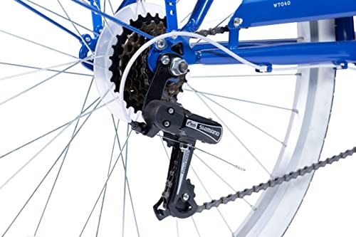 Dieses Wildtrak Fahrrad mit 26″ Laufrädern und sechs Gängen hat einen niedrigen Rahmen und kommt in einem eleganten Königsblau daher