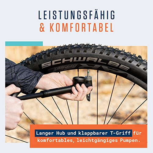 FÜR ALLE VENTILE – Die Minipumpe mit intelligentem Pumpenkopf passt ohne Umbau für Presta- (SV) und Schrader-Ventile (AV), mit beiligendem Adapter auch auf Dunlop-Ventile (DV) und schafft bis zu 8,3 Bar (120 PSI) Druck. Perfekt für City-, Touren- oder Rennrad und MTB.