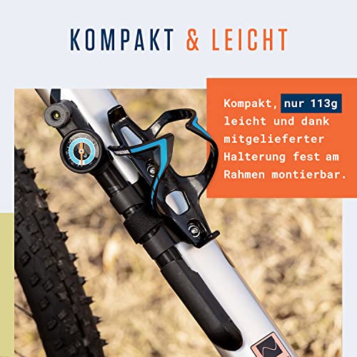KOMPAKT UND LEICHT – Verschwindet mit 27 cm Länge und nur 113 g Gewicht problemlos in jeder Tasche und hält mit der mitgelieferten Halterung rüttelsicher am Bike.