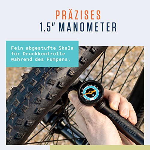 Alphatrail Minipumpe Steve – Für alle Ventile 8,3 Bar / 120 PSI Maximaldruck I Großes Rundmanometer (Ø32mm) I Ergonomischer T-Griff I Luftpumpe für französisches Ventil, Auto-Ventil & Dunlop-Ventil