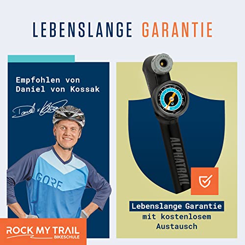 Specification: Alphatrail Minipumpe Steve – Für alle Ventile 8,3 Bar / 120 PSI Maximaldruck I Großes Rundmanometer (Ø32mm) I Ergonomischer T-Griff I Luftpumpe für französisches Ventil, Auto-Ventil & Dunlop-Ventil