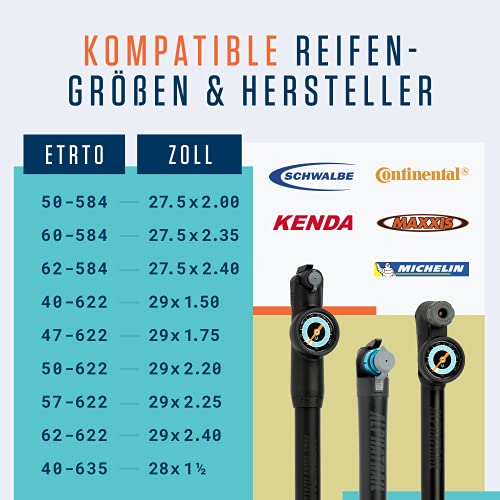 KOMPATIBLE REIFENGRÖßEN – Unser Fahrradschlauch ist mit folgenden Fahrradreifen kompatibel: 50-584 (27.5 x 2.00), 60-584 (27.5 x 2.35), 62-584 (27.5 x 2.40), 40-622 (28 x 1.50), 47-622 (28 x 1.75), 47-622 (29 x 1.75), 50-622 (28 x 2.00), 50-622 (29 x 2.00), 57-622 (28 x 2.25), 57-622 (29 x 2.25), 62-622 (28 x 2.40), 62-622 (29 x 2.40), 40-635 (28 x 1.50). Die jeweilige Reifengröße ist einfach vom Fahrradreifen (Seitenwand) ablesbar.