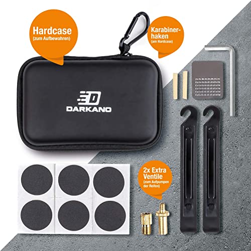 DARKANO Fahrrad Multitool – Fahrrad Werkzeug mit Karabiner Haken – [16] Teile – inklusive Hard Case & 2 extra Ventile zum Aufpumpen der Reifen – Multitool Fahrrad