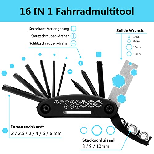 Multitool Fahrrad: Das 16-in-1 Fahrradwerkzeug enthält: Sechskantschlüssel 2 / 2,5 / 3 / 4 / 5 / 6 mm; Kreuz und Schlitzschraubendreher und Speichenschlüssel. Socket Extension Rod, Steckschlüssel Sechskant-Schraubenschlüssel 8/9/10/mm; Solide Wrench 8/10/15/mm.